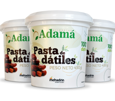 Las propiedades de los dátiles son muchas. Su sabor también es único. Una de sus características principales es la posibilidad de endulzar las preparaciones sin necesidad de agregar azúcar. La *Pasta de dátiles Adamá* es un producto 100% natural que se puede utilizar como mermelada, para rellenos de tortas o alfajores o para preparar picadas innovadoras. Vas a obtener todo el dulzor que quieras, con una textura única y sin agregar azúcar. La *Pasta de dátiles Adamá* está disponible en envases de 450 gr para distribución minorista y envase de 6.5 kg para uso...