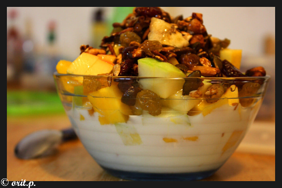 Mezcla de frutas: banana, manzana, pelón, pera, ½ taza de granola, 1 taza de yogurt natural, 4 cucharadas de Silán Kinneret Farm, chips de chocolate (opcional)